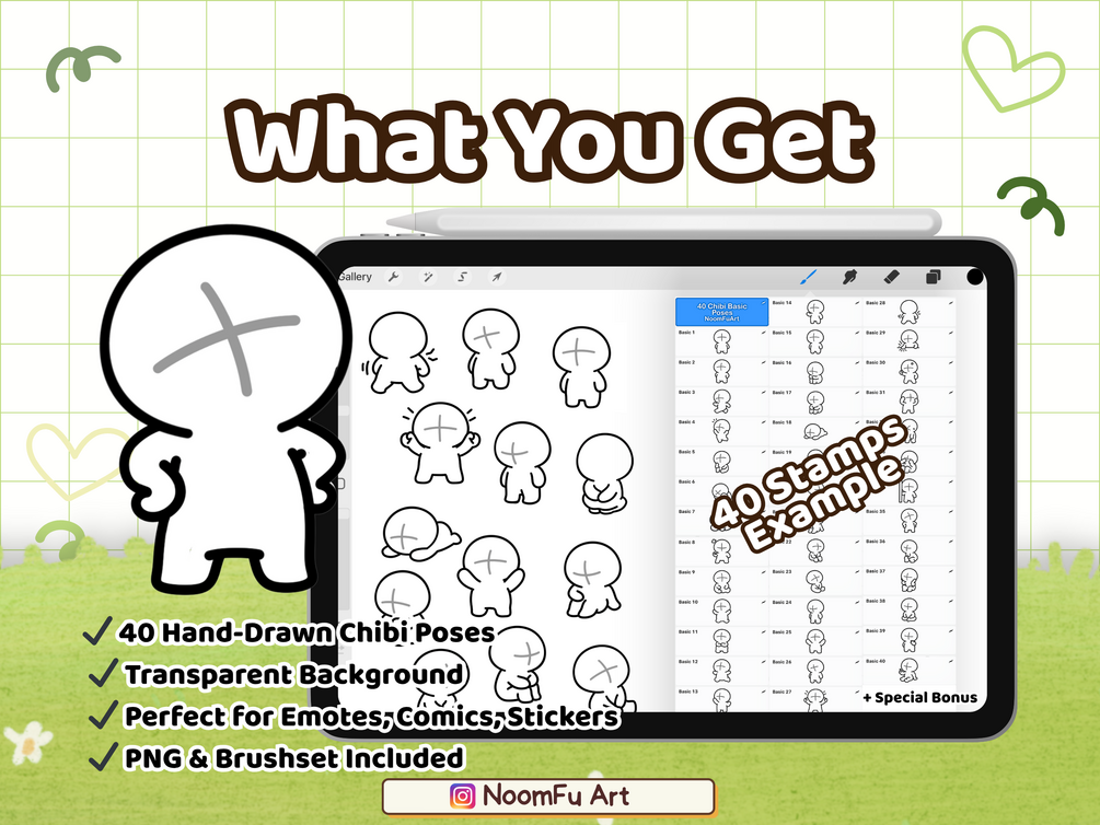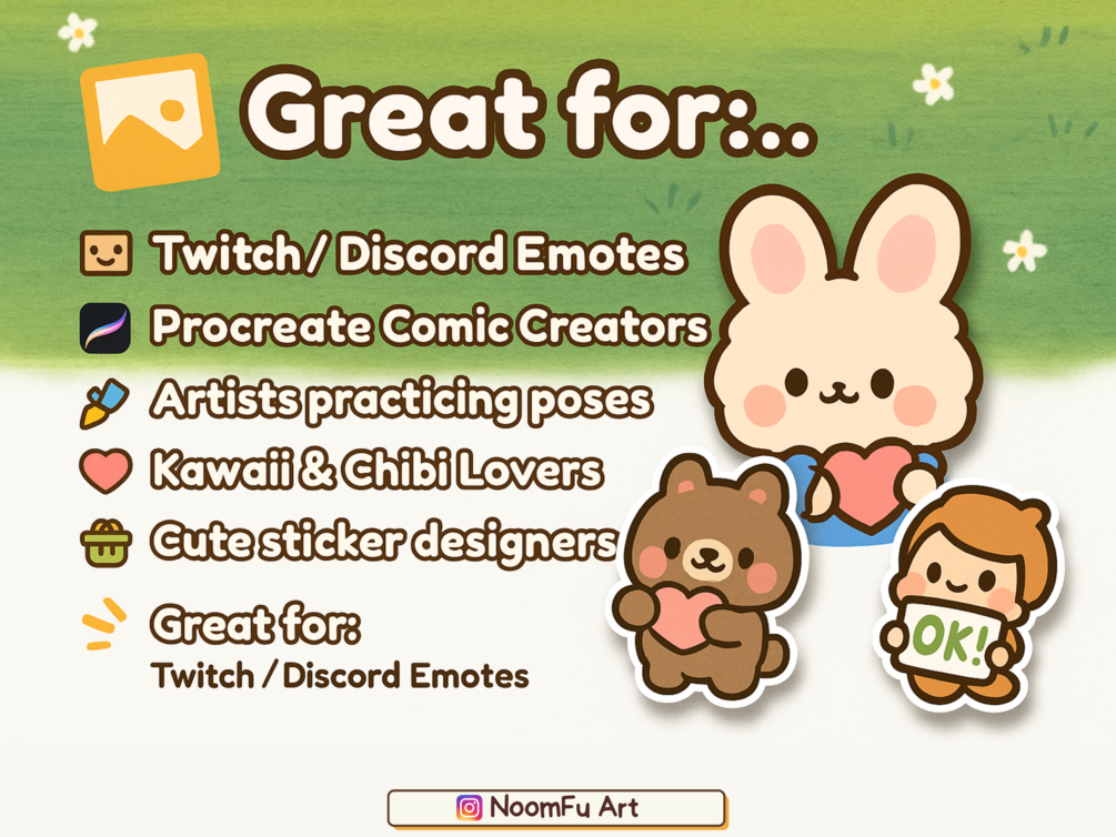 Speed up your workflow and bring your kawaii characters to life with this 40-piece Procreate stamp pack โ featuring basic chibi poses perfect for comics, emotes, stickers, and more!